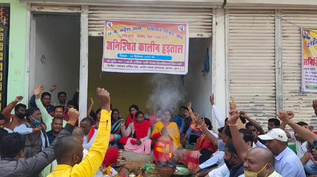 बकावण्ड ब्लॉक के जनपद पंचायत मुख्यालय के समीफ प्रदेश पंचायत सचिव संगठन की आहवान पर एक सूत्रीय मांग परिवीक्षा अवधि पश्चात शासकीय करण की मांग को लेकर दिनांक26/12/2020 से काम बंद कलम बन्द धरना प्रदर्शन जारी है।किंतु शासन प्रशासन के द्वारा जायज मांगों के संबंध में विचार नहीं करने के कारण धरना प्रदर्शन को उग्र करते हुए पंचायत सचिव संघ एवं ग्राम रोजगार सहायक संघ ने एक ही बेनर तले उग्र आंदोलन व धरना प्रदर्शन एवं हवन पूजा पाठ किया ।जिससे राज्य सरकार को सत बुद्धि दे और निर्णय लेकर