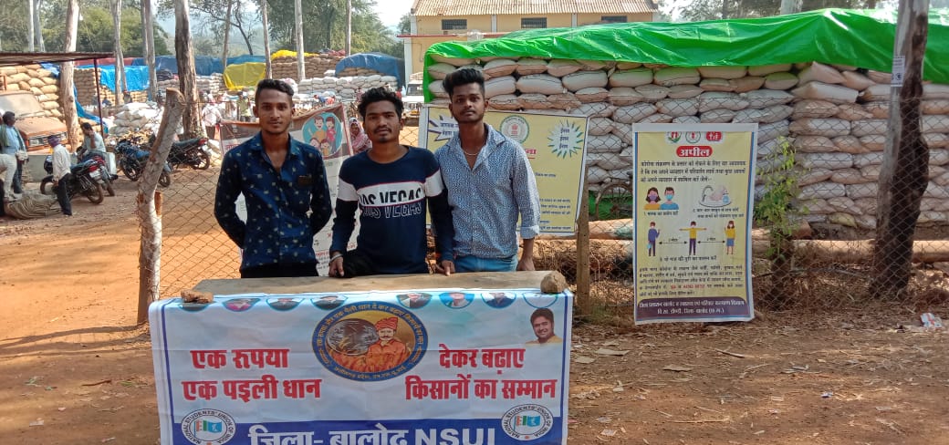 किसानों से 1 रुपया और 1पइली धान सहयोग के रूप में लिया जिसमे किसानों द्वारा बढ़ चढ़ कर सहयोग मिला जिसमे प्रमुख रूप से विधानसभा उपाध्यक्ष दिनेश यादव ,अशोक श्रीवास्तव ,हेमंत पटेल ,चेतन ठाकुर ,अभय , सिद्दार्थ ,आकाश ,निहाल ,संभाग सहसंयोजक एस निशा आदि NSUI कार्यकर्ता उपस्तिथ थे |