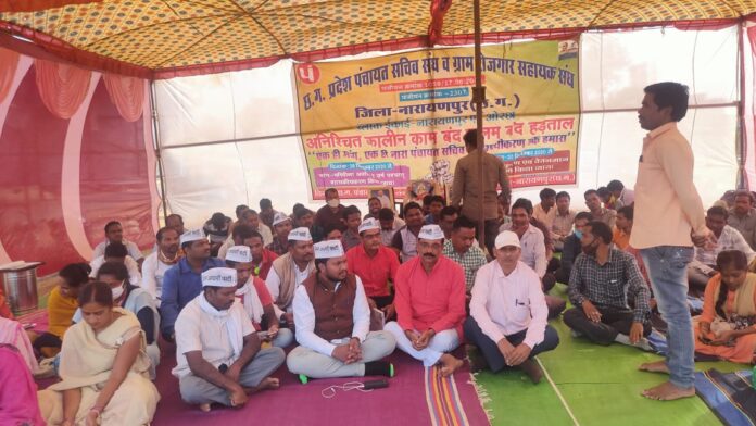 प्रदेश भर में पंचायत सचिव संगठन के आह्वान पर नारायणपुर में भी पंचायत सचिव अपनी मांगों को लेकर बाजार चौक में धरने पर बैठ गए है। वही रोजगार सहायक सचिव भी अपनी मांगों को लेकर लाम्बन्ध हो गए है, और सचिवो के साथ वो भी अपनी माँगो के लेकर धरने पर बैठे है। आज आम आदमी पार्टी के पदाधिकारियों ने आज धरना स्थल में जाकर सचिवों की सरकार से जायज माँगो का समर्थन किया।