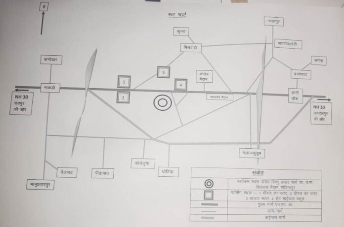 कांकेर- प्रदेश के मुख्यमंत्री भूपेश बघेल के कार्यक्रम स्थल विष्णुप्रसाद शर्मा भारती हायर सेकेण्डरी स्कूल मैदान गोविंदुपर में 28 जनवरी को आयोजित कार्यक्रम के लिए पार्किंग की व्यवस्था की गई है। रूट क्रमांक 01 में पार्किंग स्थल क्रमांक-03 बाजार स्थल गोविंदपुर में तहसील चारामा के ग्राम शाहवाड़ा, नरहरपुर के कुरना और कांकेर तहसील के ग्राम नारा, सिदेसर, भीरावाही के लोंगों के लिए पार्किंग व्यवस्था की गई है। रूट क्रमांक 02 पार्किंग स्थल क्रमांक-01 और 02 में धीरज ठाकुर का खेत में चारामा, लखनपुरी और कांकेर तहसील के ग्राम नाथियानवागांव, पांडरवाही, गौरगांव, मुड़पार, कोकड़ी, बागोडार और माकड़ी के लोगों के लिए पार्किंग व्यवस्था की गई है। इसी प्रकार रूट क्रमांक 03 में पार्किंग क्रमांक-01 और 02 में धीरज ठाकुर का खेत में भानुप्रतापपुर तहसील के ग्राम कोरर तथा कांकेर तहसील के मरकाटोला, धनेलीकन्हार, पोण्डगांव और बारदेवरी के लोगों के लिए पार्किंग की व्यवस्था की गई है। रूट क्रमांक 04 में पार्किंग स्थल क्रमांक-01 और 02 धीरज ठाकुर का खेत गोविंदपुर में कांकेर तहसील के ग्राम पीढ़ापाल, तुलतुली, मांदरी और कुरिष्टीकुर के लोगों के लिए पार्किंग की व्यवस्था की गई है। रूट क्रमांक 05 पांिर्कग स्थल क्रमांक-01 और 02 धीरज ठाकुर का खेत गोविंदपुर में कांकेर तहसील के ग्राम कोकपुर, मांलगांव, ठेलकाबोड, चिवरांज, कोडेजुंगा, नवागांव और घोटिया के लोंगों के लिए पार्किंग की व्यवस्था की गई है।