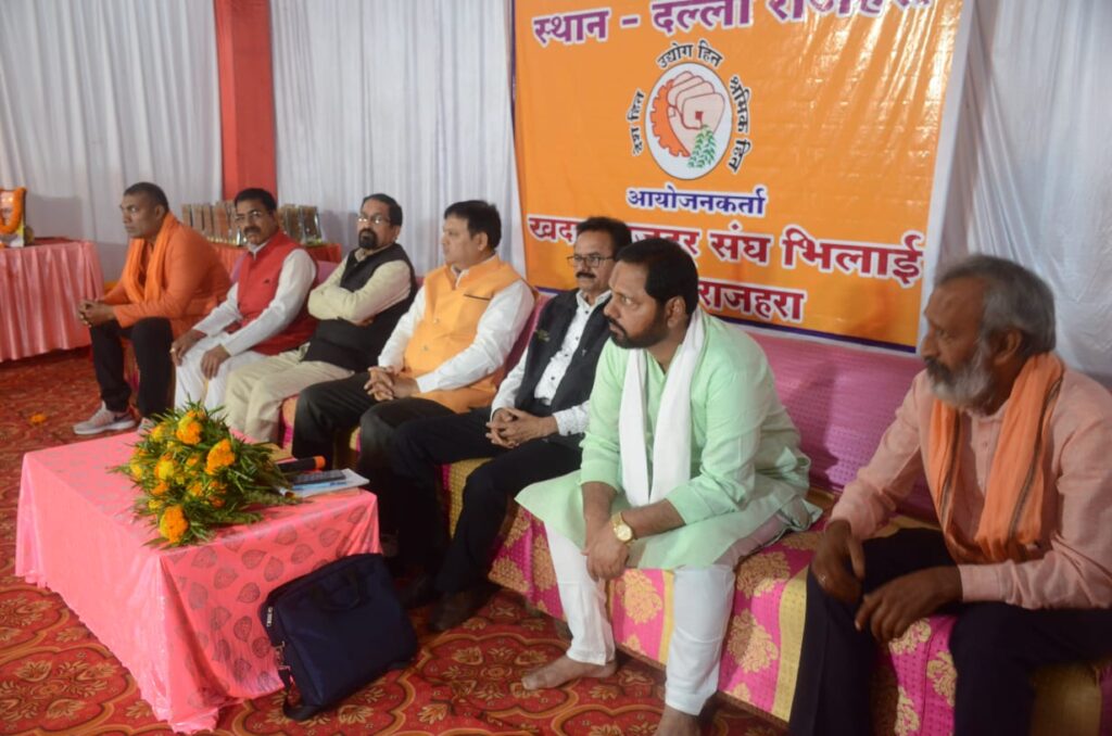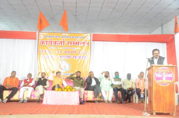 कल दिनांक 31-01-2021 को भारतीय मजदूर संघ का जिला स्तरीय कार्यकर्ता सम्मेलन ओपन एयर थियेटर में रखा गया था कार्यक्रम के मुख्य अतिथि भारतीय मजदूर संघ के प्रदेश अध्यक्ष श्री शिव कुमार कश्यप, मुख्य वक्ता के रूप में भारतीय मजदूर संघ के प्रदेश महामंत्री श्री राधेश्याम जायसवाल जी, कार्यक्रम की अध्यक्षता स्थानीय इकाई के अध्यक्ष किशोर कुमार मायती, विशिष्ट अतिथि के रूप में भारतीय मजदूर संघ के प्रदेश असंगठित क्षेत्र के सहप्रभारी श्री योगेश दत्त मिश्रा जी, भारतीय मजदूर संघ के प्रदेश उपाध्यक्ष श्री गुलेन्द यादव जी उपस्थित हुए थे। कार्यक्रम का शुभारंभ उपस्थित अतिथियों ने भारत मां, विश्वकर्मा जी,दंतोपंत ठेंगड़ी जी के छायाचित्र पर माल्यार्पण कर,दीप प्रज्जवलित कर किया गया , तत्पश्चात संगठन गीत स्थानीय शाखा के सचिव लखन लाल चौधरी ने लिया उसके बाद स्वागत भाषण खदान मजदूर संघ भिलाई के महामंत्री श्री एम पी सिंग ने दिया, उसके बाद क्रमशः सभी अतिथियों ने सभा को संबोधित किया सर्वप्रथम सभा को प्रदेश उपाध्यक्ष श्री गुलेन्द यादव जी ने संबोधित किया और कहा कि प्रदेश नेतृत्व आपके श्रमिक हित में किए गए हर संघर्ष में आपके साथ है और प्रदेश का पुरा सहयोग आपको हमेशा मिलता रहेगा।