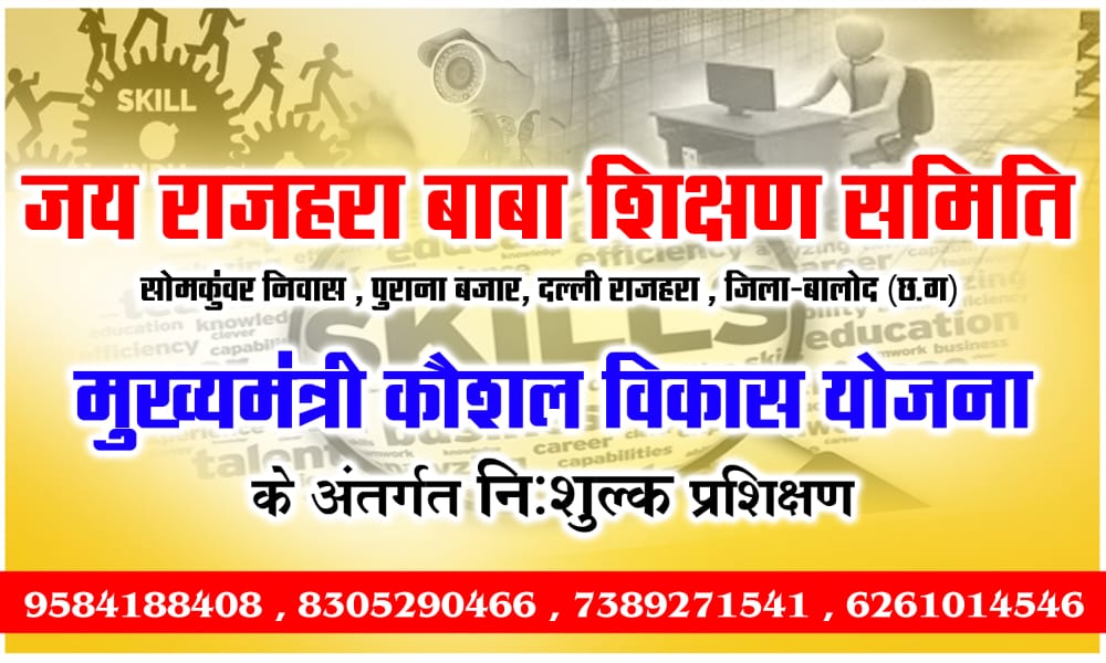 बालोद जिले के दल्ली राजहरा (लौह अयस्क नगरी) में स्थित जय राजहरा बाबा शिक्षण समिति , दल्ली राजहरा के द्वारा विभिन्न प्रशिक्षणों के माध्यम से युवाओं व बच्चों में तकनीकी जागरूकता फैलाई जा रही है , जिसमे की बच्चे व युवा विभिन्न क्षेत्रों से आकर अपना भविष्य गढ़ रहे है , मुख्यमंत्री कौशल विकास योजना के तहत संस्था में निःशुल्क डोमेस्टिक डाटा एंट्री ऑपरेटर एवं सी. सी. टी वी इंस्टॉलेशन टेक्नीशियन का प्रशिक्षण उपलब्ध है व प्रशिक्षण प्रारंभ किया जा चुका है , रुचि दिखाने वाले छात्र , छात्राएं जल्द सम्पर्क कर अपने उज्ज्वल भविष्य को गढ़े ।