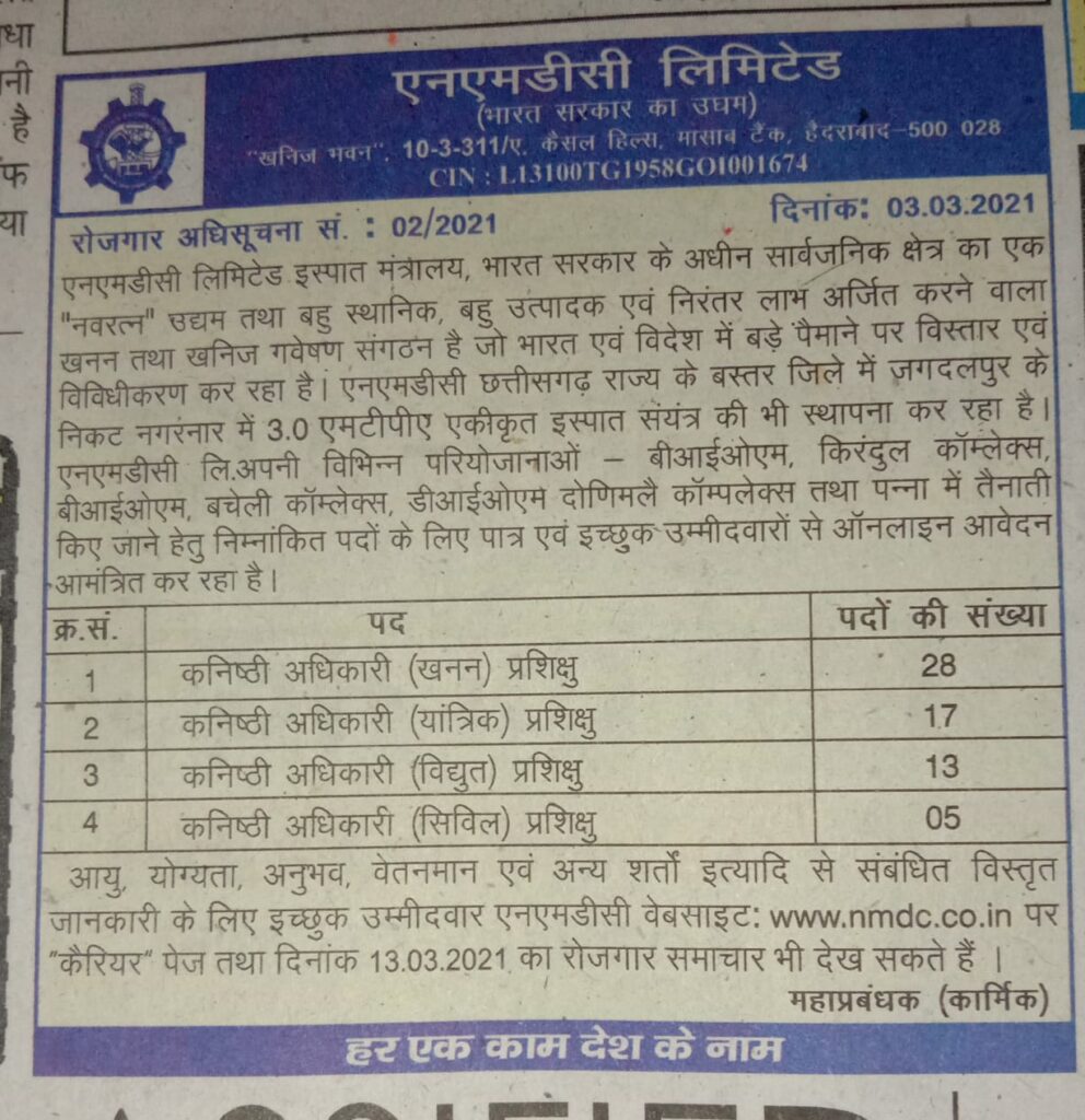 जगदलपुर। छत्तीसगढ़ के वन प्रांतर बस्तर के नगरनार स्टील प्लांट के संचालन के लिए राज्य सरकार विधानसभा में संकल्प पारित करा चुकी है। मुख्यमंत्री भूपेश बघेल ऐलान कर चुके हैं कि सरकार इस प्लांट को निजी हाथों में जाने से बचाने के लिए खुद चलायेगी। इधर केंद्र सरकार द्वारा प्लांट का डी-मर्जर किये जाने की तैयारियों के बीच बस्तरवासियों ने विरोध का जबरदस्त मोर्चा खोल दिया है और बस्तर जिले में लगातार प्रदर्शन किया जा रहा है। लिहाजा इस मामले को भटकाने के लिए 63 पदों पर नियुक्ति हेतु विज्ञापन जारी किया गया है। मगर इसमें चोरी चोरी चुपके चुपके वाला अंदाज साफ तौर पर सामने आ रहा है। यह आश्चर्यजनक है कि स्टील प्लांट के नाम पर नियुक्ति के बजाए चार खदानों में नियुक्ति की जायेगी।