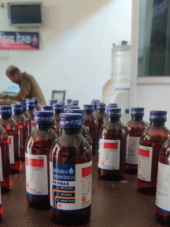 नाम आरोपी:- पवन त्रिपाठी उम्र 27 वर्ष निवासी समुंद चौक विजय वार्ड क्रमांक-02 जगदलपुर। बरामदः- REXMAS Codeine Phosphate and Chlorpheniramine Maleate Syrup 100ML 40 नग, सीरप प्रत्येक 120/-रूपये जिसमें कुम मात्रा 08 ग्राम बैच नंबर ZLNOG26, जुमला कीमती 4800/-रूपये।