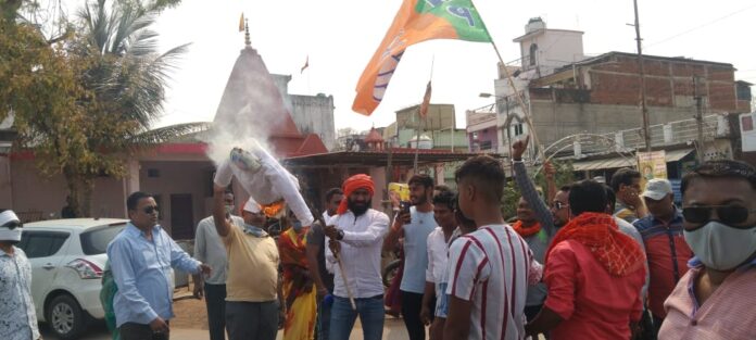 डौण्डी : छत्तीसगढ़ प्रदेश के मुख्यमंत्री भूपेश बघेल के विधानसभा क्षेत्र पाटन के बठेना ग्राम में अनुसूचित जाति एक ही परिवार के 5 लोगों के संदेहास्पद मृत्यु के प्रति प्रदेश सरकार के उदासीन रवैया को लेकर प्रदेश एवं जिला नेतृत्व निर्देशानुसार भाजपा डौण्डी मंडल द्वारा मुख्यमंत्री भूपेश बघेल का पुतला दहन दुर्गा चौक डौण्डी में कार्यक्रम सम्पन्न हुआ.