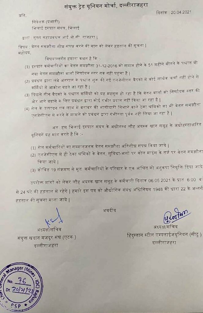 संयुक्त ट्रेड यूनियन मोर्चा दल्ली राजहरा ने आज दिनांक 20 अप्रैल 2021 को निदेशक प्रभारी भिलाई इस्पात संयंत्र भिलाई को वेतन समझौता शीघ्र संपन्न करने की मांग को लेकर हड़ताल की सूचना का मांग पत्र मुख्य महाप्रबंधक आई ओ सी राजहरा को दिया संयुक्त ट्रेड यूनियन मोर्चा में संयुक्त खदान मजदूर संघ (एटक) दल्ली राजहरा तथा हिंदुस्तान स्टील एंपलाइज यूनियन (सीटू ) दल्ली राजहरा शामिल है प्रबंधन को ज्ञापन देते तथा चर्चा में राजेंद्र बेहरा , दानसिंह चंद्राकर , राजेश कुमार साहू, पुरुषोत्तम सिमैया, प्रकाश सिंह क्षत्री, रामादीन, चार्ली आदि शामिल थे |