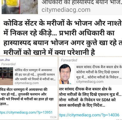 जगदलपुर। कोविड सेंटर धरमपूरा की व्यवस्था पटरी पर लौट रही है CITY MEDIA CG TEAM द्वारा लगातार इसकी कमी खामी प्रसारित कर रही थी जिसे संवेदनशील सांसद दीपक बैज द्वारा संज्ञान में लेकर एसडीएम जीआर मरकाम को व्यवस्था दुरुस्त करने फटकार लगाई थी जिसके बाद एसडीएम लगातार इसकी मॉनिटरिंग कर रहें हैं। इस सेंटर के प्रभारी डॉ मनीष पांडेय के भी दर्शन हुए।इन सब बातों के बीच यहां की साफ-सफाई स्वीपर वह सफाईकर्मी भी कर रहें हैं। खाना व्यवस्था वाले ठेकेदार को भी एसडीएम द्वारा चेतावनी देने के बाद मंगलवार रात को पुलाव, फ्राइड दाल व पके रोटी भी परोसा गया जिससे ऐसा प्रतीत हो रहा है कि भोजन व्यवस्था भी सुधर रही है। कोविड सेंटर धरमपूरा में रहने वालों ने सांसद दीपक बैज का आभार व्यक्त किया तथा CITY MEDIA CG TEAM का धन्यवाद ज्ञापित किया।