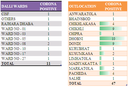 डौंडी ब्लॉक में डौंडी एवं आसपास के क्षेत्र एवं दल्लीराजहरा में वार्डवार मिले संक्रमितों कि जानकारी इस प्रकार है –