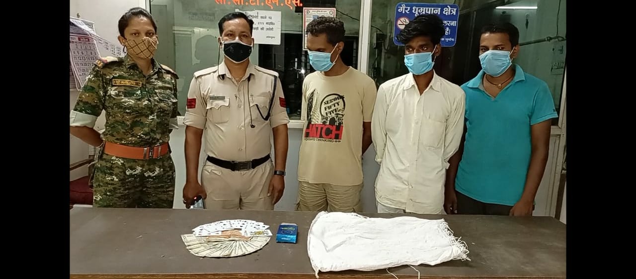 दिनांक 16.05.2021 को थाना कोतवाली क्षेत्रान्तर्गत गाय गोठान के पास झारउमर गांव में कुछ व्यक्तियों द्वारा अवैध रूप से रूपये पैसों का दांव लगाकर हारजीत का जुआ खेल रहे है कि सूचना प्राप्त हुई थी जिस पर श्रीमान वरिष्ठ पुलिस अधीक्षक महोदय, श्री दीपक झा व अतिरिक्त पुलिस अधीक्षक ओमप्रकाष शर्मा के मार्गदर्षन एवं नगर पुलिस अधीक्षक हेमसागर सिदार के पर्यवेक्षण में थाना प्रभारी कोतवाली निरीक्षक एमन साहू के नेतृत्व में थाना कोतवाली के हमराह स्टाफ उपनिरीक्षक गुनेश्वरी नरेटी, प्रधान आरक्षक चोवादास गेंदले, आरक्षक प्रकाश नायक, गायत्री प्रसाद तारम, सैनिक 227 शिव कुमार यादव के टीम तैयार कर, तत्काल घटनास्थल पहुंचा जहां पर कुछ व्यक्तियो द्वारा रूपये पैसो का दांव लगाकर जुआ खेलते मिले। जिसे मौके पर पुछताछ करने पर अपना नाम 1. चतुर कश्यप पिता रतन कश्यप उम्र 24 साल निवासी बेडा उमरगांव ठोठापारा 2. सावन कुमार पानीगा्रही पिता नीलाम्बर पानीग्राही उम्र 37 साल निवासी आसना नयापारा 3. महेन्द्र सिंह बघेल पिता स्व0 महादेव सिंह बघेल उम्र 46 साल निवासी आसना बनवापारा का होना बताया। मौके पर उक्त आरोपियों के कब्जे से नगदी रकम 7110/-रूपये, व मोटर सायकल बिना नंबर ग्लैमर एवं स्पलेण्डर सिल्वर रंग का CG 27 B 9425 तास के 52 पत्ते को जप्त किया गया तथा आरोपियो के विरूद्ध धारा 13 जुआ एक्ट के तहत गिरफ्तार कर जमानत मुचलका पर रिहा किया गया।