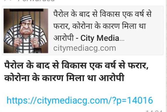 जगदलपुर थाना कोतवाली जगदलपुर में हत्या के मामले में दण्डित बंदी विकास दास को केन्द्रीय जेल जगदलपुर से अस्थाई मुक्ति पैरोल पर दिनांक 27.05.2020 को रिहा किया गया था जिसे पैरोल अवधि समाप्त होने पर जेल प्रवेश नहीं होकर लगभग एक वर्ष फरार रहा था। विगत दिनों इस मामले को Citymedia.cg टीम ने प्रमुखता से प्रकाशित किया था। जिसकी पता तलाशी हेतु थाना में एक स्पेशल टीम गठित किया गया था, फरार बंदी विकास दास को पकड़कर, गिरफ्तार किया गया है।