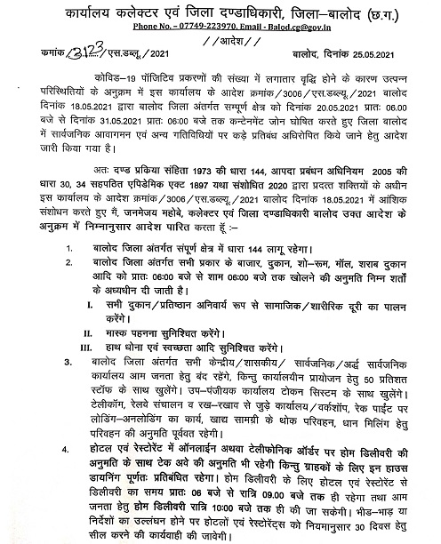 छत्तीसगढ़क्षेत्रीय समाचार Breaking बालोद जिला कलेक्टर ने पुनः लॉकडाउन में किया संशोधन, जाने इस बार क्या निर्देश जारी किये By City Media - May 25, 2021 0 1950 Facebook Twitter Google+ Pinterest WhatsApp बालोद – बालोद जिला कलेक्टर जन्मेजय महोबे ने कोरोना संक्रमण की स्थिति को देखते हुए पुनः लॉकडाउन में संशोधन किया है | देखे जिले में लॉकडाउन में क्या क्या संशोधन किये गए है –
