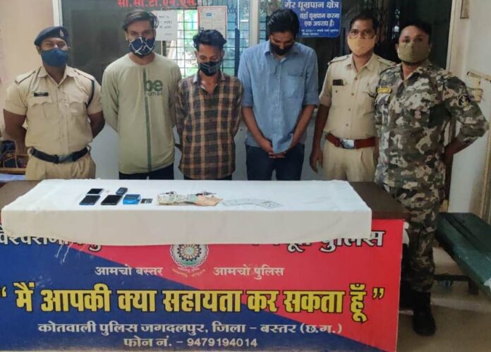 दुबे उम्र 19 साल निवासी महारानी वार्ड जगदलपुर 2. राज धु्रव पिता अरूण धु्रव उम्र 20 साल निवासी महारानी वार्ड 3. सन्नी सिंह पिता सुन्दरपाल सिंह उम्र 27 साल निवासी हाउसिंग बोर्ड कालोनी दुर्गा मंदिर के पीछे जगदलपुर का होना बताया। मौके पर उक्त आरोपियों के कब्जे से नगदी रकम 2190/-रूपये, व 04 नग मोबाईल तथा मोसा0 पेशन प्रो क्र-CG 17 KA 9242स्कुटी जुपिटर क्र- CG17 KL 3598 एक्टीवा स्कुटी सिल्वर ब्लेक कलर क्र-CG17 KS 9080 तथा टीव्ही0एस0 पिंक व्हाईट कलर क्र0- CG17A 7143 व तास के 52 पत्ते जुमला कीमती 1,00000/-रूपये को जप्त किया गया तथा आरोपियो के विरूद्ध धारा 13 जुआ एक्ट के तहत गिरफ्तार कर जमानत मुचलका पर रिहा किया गया।
