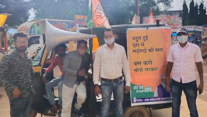नारायणपुर – छत्तीसगढ़ प्रदेश कांग्रेस प्रभारी पीएल पुनिया मुख्यमंत्री भूपेश बघेल, प्रदेश कांग्रेस कमेटी अध्यक्ष मोहन मरकाम जी के आहान पर पर जिला कांग्रेस कमेटी के दिशा निर्देश से ब्लॉक कांग्रेस कमेटी नारायणपुर ने बढ़ते कमर तोड़ महंगाई के विरोध मे नगरीय निकाय और ग्रामीण क्षेत्र मे ऑटो मे लाउड स्पीकर लगा कर मोदी सरकार के भाषणों को सुनाया गया महंगाई को डायन बताने वाली मोदी सरकार की यही डायन आज देश के गरीब मजदूर आम जनता का जीना दुभर कर दि है देश की एक एक जनता इस महंगाई से त्रस्त है कोरोना संक्रमण से बर्बाद हो चुके पीड़ित परिवार पर अब महंगाई का बोझ उसे जीने नहीं दे रही है पेट्रोल का कीमत 100 रूपए के पार हो चूका है सरसो का तेल 200 के पार हो चूका है पेट्रोल की कीमत बढ़ने से अन्य सभी वस्तुओ का दम दुगना हो गया है!