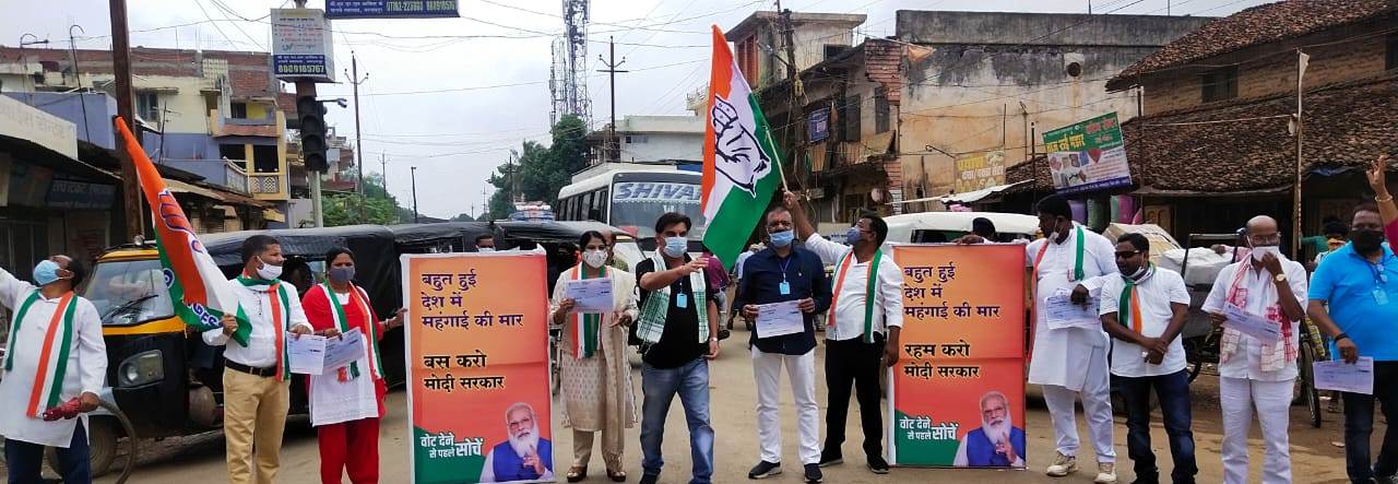 जगदलपुर। छत्तीसगढ़ प्रदेश कांग्रेस कमेटी के निर्देश पर बस्तर जिला कांग्रेस कमेटी शहर द्वारा बेहताशा महंगाई के विरोध में सांकेतिक रुप से चक्का जाम कर केंद्र की मोदी सरकार को कटघरे में खड़ा किया। बहुत हुई महंगाई की मार अब तो रहम करो सरकार , पेट्रोल -100 ,खाने का तेल 200 अब तो मोदी सरकार जनता को बख्श दो जैसे नारों के साथ बस्तर जिला कांग्रेस कमेटी शहर अध्यक्ष राजीव शर्मा विधायक रेखचंद जैन व महापौर श्रीमती सफीरा साहू के नेतृत्व में पार्षद दल, कांग्रेस दल ने पांच मिनट तक वाहनों को कोर्ट तिराहे पर रोक कर चक्का जाम किया। इस दौरान प्रदेश महासचिव यशर्वधन राव, योगेश पानीग्राही, निगम सभापति कविता साहू , जिला महामंत्री अनवर खां गौरनाथ नाग सहित निगम के पार्षदगण उपस्थित थे। इसी प्रकार प्रदेश स्तरीय आव्हान पर कांग्रेस पार्टी के अनुषांगिक संगठनों ने चौक-चौराहों में सांकेतिक रूप से चक्का जाम किया। ग्रामीण अंचलों में ब्लाक कांग्रेस कमेटी द्वारा भी चक्काजाम कर विरोध जताया।
