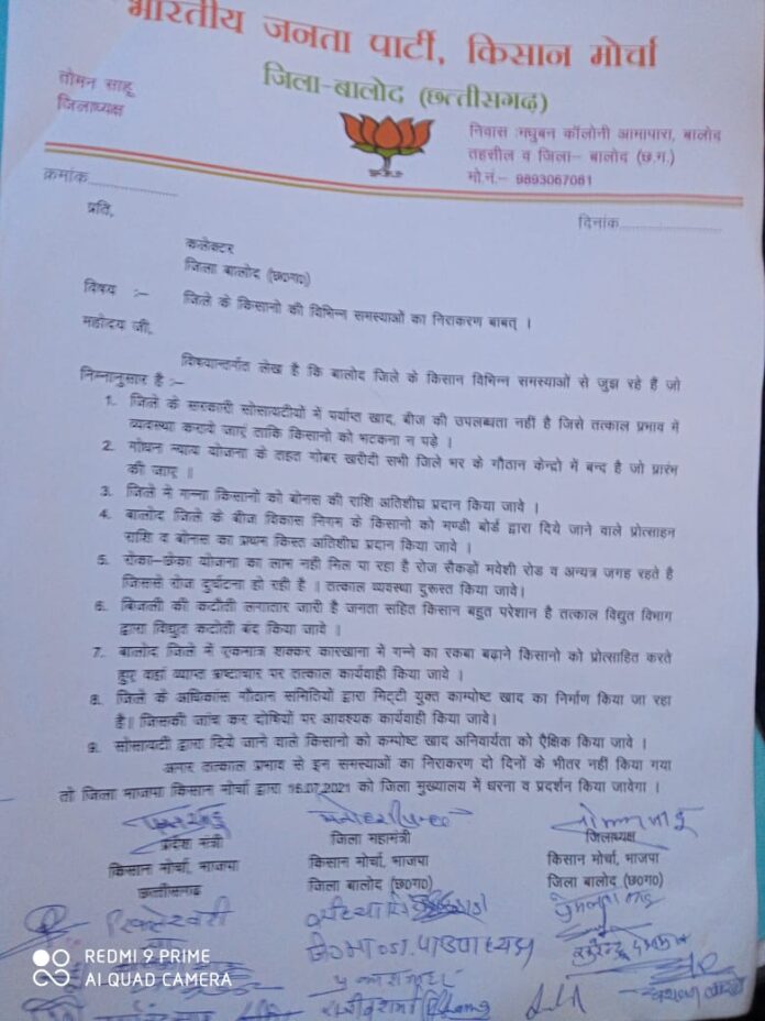 ज्ञापन सौंपने वालों में भाजपा उपाध्यक्ष संध्या भरद्वाज प्रदेश मंत्री किसान मोर्चा पवन साहू जिला अध्यक्ष किसान मोर्चा तोमन मन साहू मंडल अध्यक्ष प्रेम साहू जिला महामंत्री किसान मोर्चा मनोहर सिन्हा जिला कोषाध्यक्ष रोमन सोनकर पालक ठाकुर प्रकाश नहर सुरेंद्र देशमुख कृतिका साहू खिलेश्वरी साहू राजू शर्मा प्रेमलता साहू रश्मि साहू सत्या गवारे मोहनी देवांगन पूनम साहू महेश्वरी नेताम बिरेंद्र साहू दानेश्वर मिश्रा अरुण साहू शशिकांत साहू कन्हैया यादव देवधर साहू जयंत साहू पार्थ साहू संजय जांगडे विजय साहू दुष्यंत गिरी गोस्वामी श्यामल साहू संदीप पवन साहू संजय साहू शुभम यादव गुलशन साहू आदि उपतिथा रहे.