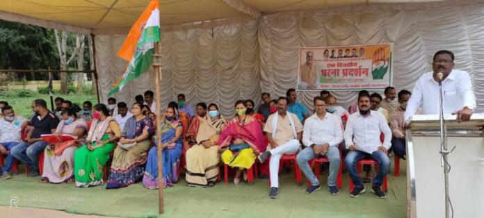 छत्तीसगढ़ प्रदेश कांग्रेस अध्यक्ष मोहन मरकाम के निर्देशानुसार जिला कांग्रेस कमेटी और ब्लॉक कांग्रेस कमेटी के सयुक्त तत्वाधान मे नगर के बीच चौराहा जय स्तभ चौक मे केंद्र की मोदी सरकार के गलत नीतियों से उत्पन्न किसानो के सामने खाद संकट को लेकर केंद्र की मोदी सरकार के खिलाफ एक दिवसीय धरना प्रदर्शन किया गया और प्रधानमंत्री के नाम तहसीलदार नारायणपुर को ज्ञापन सौपा गया धरना प्रदर्शन मे पीसीसी महामंत्री रजनू नेताम ने कहा की जब से छत्तीसगढ़ मे कांग्रेस की सरकार बनी है केंद्र की भाजपा सरकार ने सौतेला व्यवहार करना शुरू कर दिया है आज इसी सौतेले व्यवहार के कारण किसानों के सामने खाद का संकट आ पड़ा है! जिला कांग्रेस अध्यक्ष देवनाथ उसेंडी ने कहा की छत्तीसगढ़ मुखिया भूपेश बघेल के बार बार मागने पर भी मोदी सरकार छत्तीसगढ़ किसानों के आवश्यकता अनुसार भी मोदी खाद नहीं भेज रहे है जिससे प्रदेश के किसान प्रभावित हो रहे है और या तो फिर व्यापारियों से अधिक दर पर खाद लेने को मजबूर है यहा विडबना है की केंद्र के खिलाफ हमें लगातार धरना देते रहना पड़ता है और केंद्र सरकार अपने सौतेले रवैया से बाज नहीं आती! ब्लॉक कांग्रेस अध्यक्ष रवि देवांगन ने कहा की जब से छत्तीसगढ़ मे कांग्रेस की सरकर बनी है प्रदेश के मुख्यमंत्री भूपेश बघेल किसानों का तत्काल कर्जा माफ़ कर लगतार किसानों को की स्तिथि बेहतर बनाने और खेती मे लगात का दुगना आए करने उचित कदम उठा रहे है, मोदी सरकार किसानों का आए दुगना करने का वादा कर किसानों और प्रदेश सरकार के साथ सौतेला व्यवहार कर रहे है प्रदेश सरकार से केंद्र सरकार का अनुबंध है की 11:76 लाख मेट्रिक टन खाद छत्तीसगढ़ को दिया जाना है किन्तु मोदी जी जुलाई माह तक आधा भी खाद नहीं भेजे हैँ केंद्र की मोदी सरकार लगातार किसानों पर कुठाराघात करने मे आतुर हैँ संसद मे तीन काले कानून लाने के बाद आंदोलन करने वाले किसानो से बात तक करना उचित नहीं समझा और ना ही किसान कानून को रद्द कर रहे है! धरना प्रदर्शन के दौरान पीसीसी सदस्य राजेश दीवान, नगर पालिका अध्यक्ष सुनीता मांझी, जनपद पंचायत अध्यक्ष पण्डी वड्डे, नगर पालिका उपाध्यक्ष प्रमोद नैलवाल, महिला कांग्रेस अध्यक्ष रशीला कश्यप, शहर कांग्रेस अध्यक्ष रघु मानिकपुरी, अल्पसंख्यक विभाग अध्यक्ष शेख महमूस एवं अन्य कारकर्ता उपस्थित रहे!