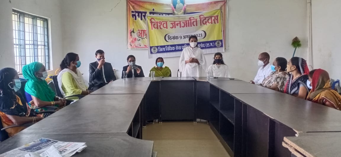 बालोद . राष्ट्रीय विधिक सेवा प्राधिकरण द्वारा संचालित योजनाओं के क्रियान्वयन एवं प्रचार प्रसार हेतु तथा छत्तीसगढ़ राज्य विधिक सेवा प्राधिकरण द्वारा जारी स्टेट प्लान आफ एक्शन के अनुसार जिला न्यायाधीश बालोद के. विनोद कुजूर जी,अध्यक्ष जिला विधिक सेवा प्राधिकरण बालोद के निर्देशानुसार सचिव जिला विधिक सेवा प्राधिकरण बालोद सुमन ध्रुव के मार्गदर्शन में आज दिनांक 09.08.2021 को विश्व जनजाति दिवस के अवसर पर नगर पंचायत चिखलाकसा में विधिक जागरूकता शिविर का आयोजन किया गया। जिसमें शांति प्रभु जैन व्यवहार न्यायाधीश दल्लीराजहरा एवं कु. आस्था यादव व्यवहार न्यायाधीश बालोद के द्वारा विश्व जनजाति दिवस, बेटी बचाओ -बेटी पढ़ाओ , घरेलू हिंसा एवं महिलाओ के संबंध में बढ़ते अपराध के बारे में व आगामी नेशनल लोक अदालत एवं विधिक जानकारी प्रदान किया गया।