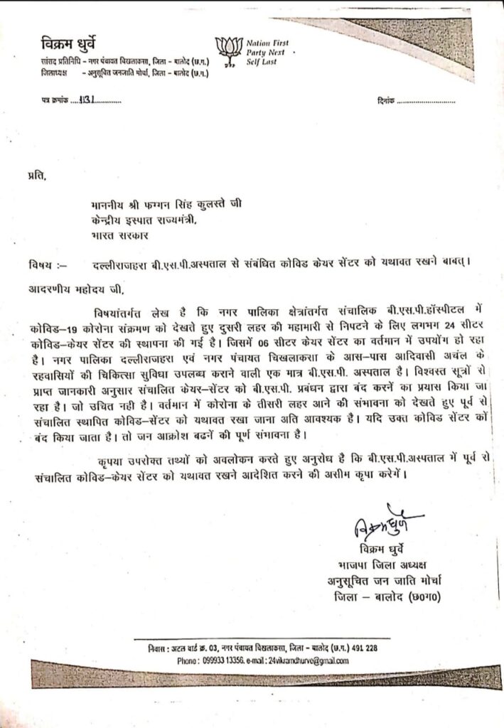 उपरोक्त तथ्यों को देखते हुए विक्रम ध्रुवे भाजपा जिलाध्यक्ष अनुसूचित जनजाति मोर्चा जिला बालोद ने फग्गन सिंह कुलस्ते केन्द्रीय इस्पात राज्यमंत्री, भारत सरकार से अनुरोध किया है कि बी.एस.पी. अस्पताल में पूर्व से संचालित कोविड-केयर सेंटर को यथावत रखने आदेशित करें |