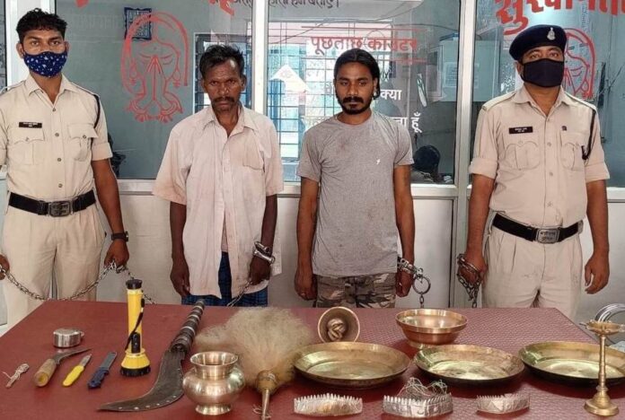 जगदलपुर। परपा थाना क्षेत्र में स्थित एक मंदिर से हजारों रुपयों के आभूषण और पुजा का सामान चोरी करने वाले दो शातिर चोरों को पुलिस ने आज बुधवार को गिरफ्तार किया है। आवश्यक कार्यवाही के बाद पुलिस ने दोनों आरोपियों को न्यायिक हिरासत में भेज दिया है।