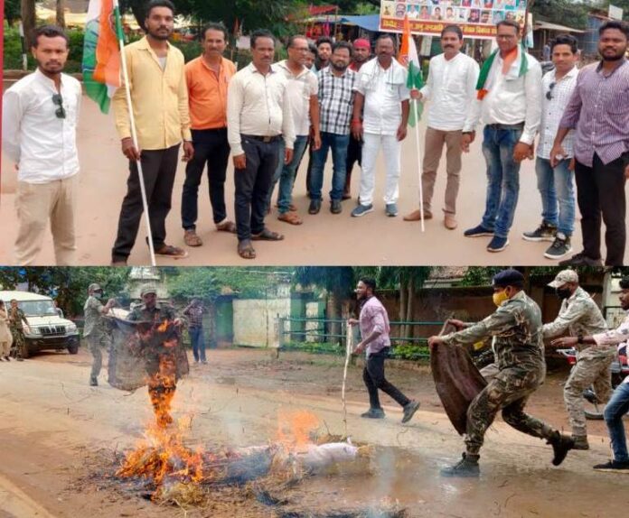 पिछले हप्ते राजयसभा मे भाजपा सांसदों के इसारे पर मार्शलो के द्वारा छत्तीसगढ़ राजयसभा सांसद फूलो देवी नेताम, और छाया वर्मा के साथ धक्का मुक्की कर दुर्व्यवहार करने के विरोध मे जिला और ब्लॉक कांग्रेस कमेटी ने नगर के जय स्तम्भ चौक मे भाजपा के नौ सांसदों के नाम से पुतला दहन किया गया! पुतला दहन के दौरान पुलिस विभाग के अधिकारी और पुलिस बल भारी संख्या मे उपस्थित थे, कांग्रेस के कार्यकर्त्ता ने तय जगह से पहले ही पुतला पर आग लगा दिया पुतला को आग लगते देख पुलिस भी पानी लेकर पहुंच गयी और झूमा झटकी किया गया, पुतला दहन के दौरान भाजपा के खिलाफ जमकर नारे बाजी किया गया! कांग्रेस के पदाधिकारीयों ने कहा की लोकतंत्र के मंदिर मे महिला सांसदों के साथ धक्का मुक्की करना बेहत ही निंदनीय घटना है जिला कांग्रेस और ब्लॉक कांग्रेस सांसदो के साथ दुर्व्यवहार की कड़ी निंदा करता है, पुतला दहन के दौरान जिला कांग्रेस अध्यक्ष देवनाथ उसेंडी, ब्लॉक कांग्रेस अध्यक्ष रवि देवांगन, शहर कांग्रेस अध्यक्ष रघु मानिकपुरी, अल्पसंख्यक विभाग अध्यक्ष शेख महमूद, जिला कांग्रेस महामंत्री शेख तौहीद, जिला कांग्रेस सचिव संजय राय, व्यापार प्रकोष्ठ प्रदेश सचिव युधिष्ठिर जैन, यूथ कांग्रेस नगर अध्यक्ष किरण वड्डे, एन एस यू आई प्रदेश सचिव जय वट्टी, एन एस यू आई जिला अध्यक्ष उमेश कर्मा, दीपक देवांगन, दीपक गाँधी, मीडिया सयोजक मिथलेश ठाकुर, एवं अन्य कांग्रेस कार्यकर्त्ता उपस्थित थे!