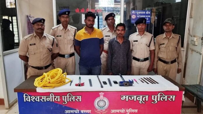 पर उक्त आरक्षकों के द्वारा अपने सुझबुझ एवं साहस का परिचय देते हुये दो संदिग्ध व्यक्तियों का पकड़ा गया है। जिस पर वरिष्ठ पुलिस अधीक्षक जीतेन्द्र सिंह मीणा एवं अति0 पुलिस अधीक्षक ओमप्रकाश शर्मा के मार्गदर्शन में नगर पुलिस अधीक्षक हेमसागर सिदार के पर्यवेक्षण में थाना प्रभारी एमन साहू के नेतृत्व में थाना स्तर पर टीम बनाकर मौके पर पहुंचकर, पुछताछ करने पर अपना नाम 1.समर सरदार 2.कमलेश नाग दोनों निवासी जगदलपुर का होना बताये, पूछताछ में दोनों ने उक्त दुकान में चोरी करने की नीयत से औज़ार लेकर आना और सेंधमारी का प्रयास करना बताये जिनके कब्जे से एक मोटरसाइकिल, 02 नग मोबाईल , लोहे का डाईराड , एक लोह का घन(हथौड़ा), एक छोटा हथौड़ी, रस्सी,कटर , रस्सी, आरी ब्लेड व सेंधमारी में प्रयुक्त अन्य औज़ार बरामद किया गया। आरोपियों का कृत्य अपराध धारा 457,511 भादवि0 का पाये जाने से अपराध पंजीबद्ध कर,विवेचना में लिया गया एवं दोनों आरोपियों को गिरफ्तार कर न्यायिक रिमांड पर जेल भेजा गया है। ज्ञात हो कि दोनों आरोपी , चंपालाल टाटिया ज्वेलरी शॉप के ठीक सामने मनिहारी ठेला लगाकर दुकान की रेकी करते थे |
