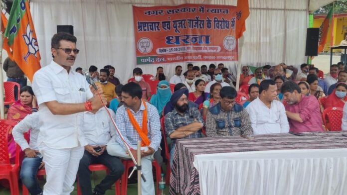 जगदलपुर !!आज नगर निगम में हो रहे हर स्तर पर भ्रष्टाचार और और संपत्ति कर में यूज़र्स चार्जेस के रूप में जो भारी बढ़ोतरी की गई है उसके विरुद्ध भाजपा पार्षद दल के तत्वाधान में भारतीय जनता पार्टी ने एक विशाल धरना प्रदर्शन का आयोजन किया ! स्थानीय सिरहासार भवन के सामने आज 12 बजे से ही भाजपा कार्यकर्ता और शहर की जनता ने सैकड़ों की संख्या में पहुँच कर इस आंदोलन में अपनी सहभागिता दी ! विदित हो कि नगर सरकार जिसकी नेता महापौर सफीरा साहू है , के गठन के पश्चात ही लगातार उन पर भ्रष्टाचार और अनियमितताओं के आरोप भाजपा पार्षद दल लगाता रहा है !