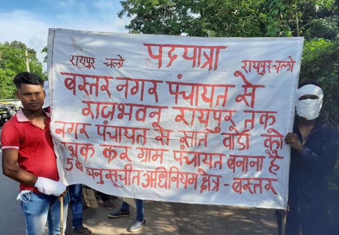 नगर पंचायत बस्तर को पुनः ग्राम पंचायत बनाने को मांग को लेकर रविवार को पैदल यात्रा मांझी पारा बस्तर से राजभवन के लिए रवाना हो चुकी है। पिछले कई सालों से नगर पंचायत बस्तर को ग्राम पंचायत बनाने की मांग की जा रही है।लेकिन आज तक नगर पंचायत बस्तर को ग्राम पंचायत बनाने को लेकर कोई पहल नही की जा रही है । नगर पंचायत बनाने के लिए 7 वार्ड के लोग सहमत नहीं है । इस दौरान नगर पंचायत अध्यक्ष डोमाय मौर्य, रामचंद्र बघेल, आदि सैकड़ो संख्या में उपस्थित थे।