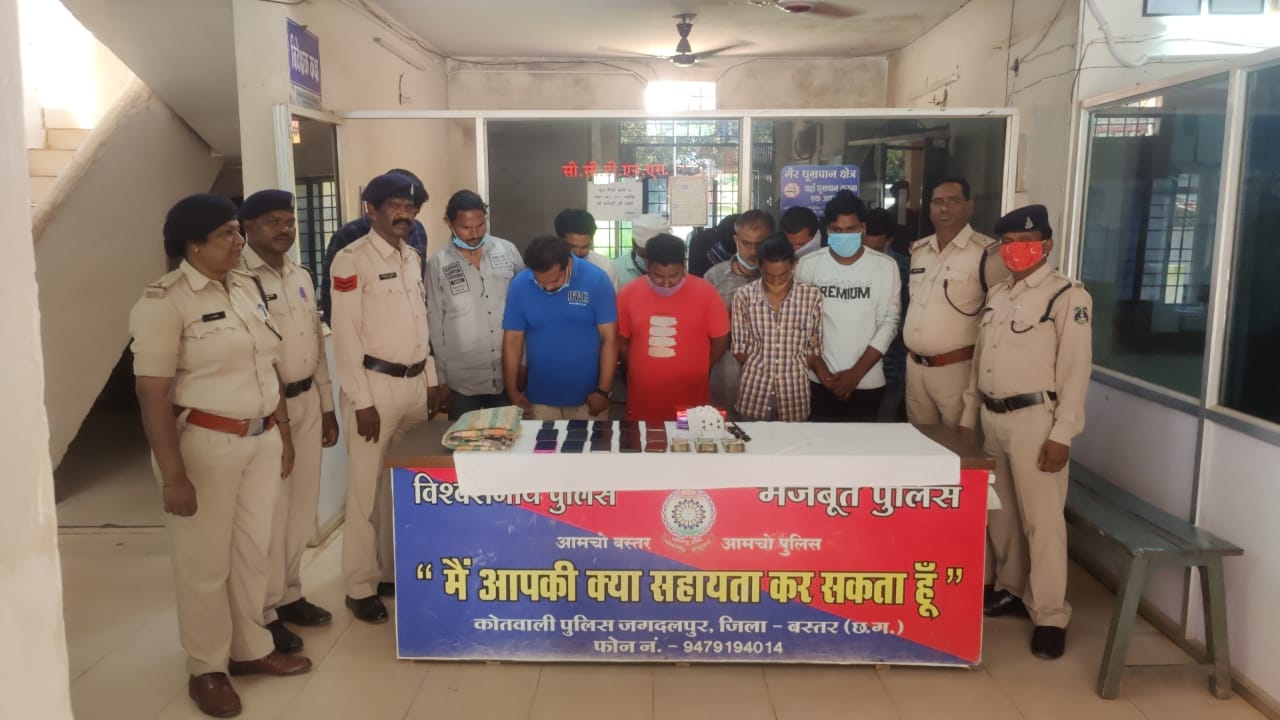 बस्तर पुलिस को नयापारा में मकान में चल रहे जुआ के फड़ पर रेड कार्यवाही कर 12 जुआड़ियों पर कार्यवाही करने में सफलता हासिल हुई है । ज्ञात हो थाना सिटी कोतवाली को सूचना प्राप्त हुई थी कि कुछ जुआड़ी नयापारा में ताश के पत्तो पर रूपये पैसे का दांव लगाकर जुआ खेल रहे है सूचना पर वरिष्ठ पुलिस अधीक्षक श्री जितेन्द्र सिंह मीणा, अति. पुलिस अधीक्षक ,ओम प्रकाश शर्मा के मार्गदर्शन एवं नगर पुलिस अधीक्षक हेमसागर सिदार के पर्यवेक्षण में थाना प्रभारी कोतवाली एमन साहू के नेतृत्व में टीम तैयार कार्यवाही हेतु रवाना किया गया था उक्त टीम के द्वारा दर्शित स्थल पर घेराबंदी कर रेड कार्यवाही किया गया । रेड कार्यवाही के दौरान 12 जुआड़ी जुआ खेलते रंगे हाथ पकड़े गये जिनके फड़ एवं पास से 1,34,000/-रूपये नगद , 15 नग मोबाइल फोन एवं ताश के पत्ते बरामद किया गया । जिनसे पूछताछ करने पर अपना नाम रामबालक , ग्वाला सिंह, रोशन झा, मनोज कुमार कुर्रे , बाबूलाल, भूपेंद्र यादव, संदीप कुमार, रामलाल सेठिया, कार्तिक कश्यप, संजू नायक, विमलेश दास एवं जमुना शुक्ला सभी निवासी जगदलपुर का होना बताएं एवं पूछताछ करने पर आरोपियों के द्वारा रुपये -पैसे का दाम लगाकर जुआ खेलना स्वीकार किया गया है उक्त 12 आरोपियों के विरूद्व सार्वजनिक जूआ एक्ट धारा 13 के तहत अपराधिक प्रकरण पंजीबद्व कर गिरफ्तार कर कार्यवाही किया गया है ।