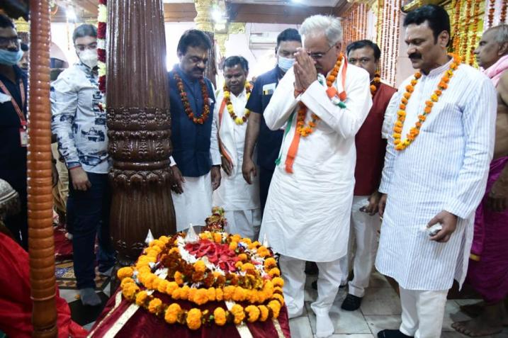 जगदलपुर. 17 अक्टूबर 2021. मुख्यमंत्री भूपेश बघेल ने आज जगदलपुर में दंतेश्वरी मंदिर में पूजा-अर्चना कर प्रदेश की सुख-समृद्धि की कामना की। उल्लेखनीय है कि मुख्यमंत्री बघेल बस्तर दशहरा में शामिल होने दो दिवसीय प्रवास पर जगदलपुर पहुंचे हुए हैं। उद्योग मंत्री कवासी लखमा, सांसद दीपक बैज, बस्तर विकास प्राधिकरण के अध्यक्ष लखेश्वर बघेल, उपाध्यक्ष विक्रम मण्डावी, संसदीय सचिव रेखचन्द जैन, हस्तशिल्प विकास बोर्ड के अध्यक्ष चंदन कश्यप, विधायकगण मोहन मरकाम, राजमन बेंजाम, देवती कर्मा, क्रेडा के अध्यक्ष मिथलेश स्वर्णकार और जगदलपुर नगर निगम की अध्यक्ष सफीरा साहू भी मौजूद थीं।
