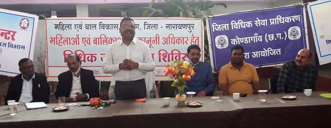 स्वामी आत्मानंद अंग्रेजी माध्यम विद्यालय सिंगोड़ीतराई नारायणपुर में मुख्य न्यायिक मजिस्ट्रेट नारायणपुर अनिल बारा के मुख्य आतिथ्य में महिला एवं बाल विकास विभाग द्वारा विधिक जागरूकता शिाविर का आयोजन किया गया। बारा ने बच्चो को कडी मेहनत एवं लगन से पढ़ाई कर षासन के सर्वोच्च पदों पर काबिज होने की समझाईश दी। वहीं अजित सिंह ने बच्चो को बाल विवाह की जानकारी दी। किरण नैलवाल चतुर्वेदी ने घरेलू हिंसा अधिनियम के बारे मे विस्तार से बताया। जिला विधिक सलाहकार सनातन मेरसा द्वारा बच्चो को किशोर न्याय अधिनियम 2015 की जानकारी विस्तार से दी गई । इस अवसर पर संस्था के प्राचार्य अली, अधिवक्ता जेएस राठौर एवं जितेन्द्र शुक्ला उपस्थित थे।