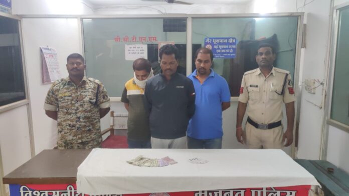 बस्तर पुलिस को आसना में चल रहे जुआ के फड़ पर रेड कार्यवाही कर 03 जुआड़ियों पर कार्यवाही करने में सफलता हासिल हुई है। ज्ञात हो थाना सिटी कोतवाली को सूचना प्राप्त हुई थी कि कुछ जुआड़ी आसना में ताश के पत्तो पर रूपये पैसे का दांव लगाकर जुआ खेल रहे है सूचना पर वरिष्ठ पुलिस अधीक्षक जितेन्द्र सिंह मीणा, अति. पुलिस अधीक्षक ,ओम प्रकाश शर्मा के मार्गदर्शन एवं नगर पुलिस अधीक्षक किरण चव्हाण के पर्यवेक्षण में थाना प्रभारी कोतवाली एमन साहू के नेतृत्व में टीम तैयार कार्यवाही हेतु रवाना किया गया था उक्त टीम के द्वारा दर्शित स्थल पर घेराबंदी कर रेड कार्यवाही किया गया । रेड कार्यवाही के दौरान 03 जुआड़ी जुआ खेलते रंगे हाथ पकड़े गये जिनके फड़ एवं पास से 7500/-रूपये नगद एवं ताश के पत्ते बरामद किया गया । जिनसे पूछताछ करने पर अपना नाम जगदीश पाणिग्रही , शंकर ठाकुर, गुरु नारायण पाणिग्रही, सभी निवासी आसना जगदलपुर का होना बताएं एवं पूछताछ करने पर आरोपियों के द्वारा रुपये -पैसे का दाम लगाकर जुआ खेलना स्वीकार किया गया है उक्त 03 आरोपियों के विरूद्व सार्वजनिक जूआ एक्ट धारा 13 के तहत अपराधिक प्रकरण पंजीबद्व कर गिरफ्तार कर कार्यवाही किया गया है ।