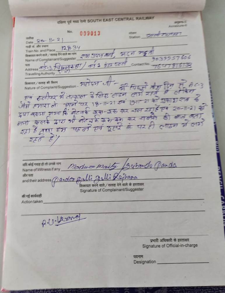 इस सम्बन्ध में स्टेशन मास्टर को कॉल किया गया था तो उन्होंने कहा वे बाहर है और इस सम्बन्ध में किसी अन्य अधिकारी से बात करें | उसके पश्चात् अन्य अधिकारी को कॉल किया गया तो उन्होंने कहा कि उन्हें इस बारे में कोई सूचना नहीं मिली जबकि शिकायत पुस्तिका में शिकायत दर्ज है और यह भी कहा कि उनकी ड्यूटी दुर्ग में है |