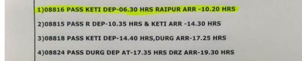 छत्तीसगढ़क्षेत्रीय समाचार आवश्यक सूचना – केंवटी से रायपुर जाने वाली पैसेंजर ट्रेन के समय में परिवर्तन By City Media - November 20, 2021 0 2507 Facebook Twitter Google+ Pinterest WhatsApp दल्लीराजहरा – केंवटी से रायपुर जाने वाली पैसेंजर ट्रेन के समय में परिवर्तन किया गया है | तकनीकी कारणों से यह ट्रेन कल सुबह 1:30 विलम्ब से आएगी |