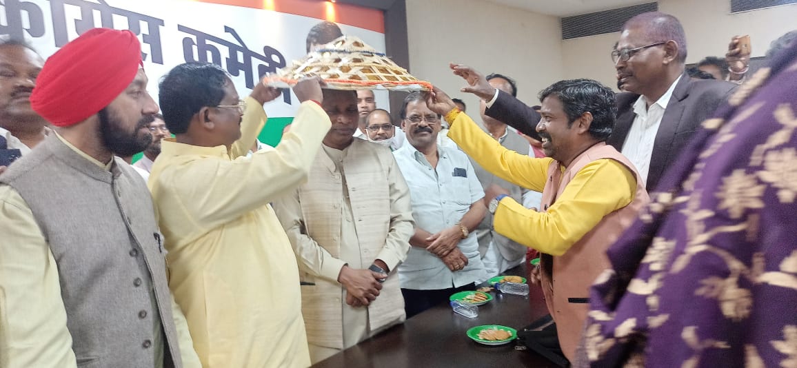 आदिवासी कांग्रेस के नव नियुक्त प्रदेश अध्यक्ष जनक ध्रुव का राजीव भवन में आदिवासी संस्कृति कंडरा समाज का पुश्तैनी व्यवसाय अनुरूप में नव नियुक्त अध्यक्ष जी को पूर्व अध्यक्ष आदिवासी कांग्रेस व कैबिनेट मंत्री अमरजीत भगत ने आदिवासी संस्कृति खुमरी पहनाकर सम्मान किया ।