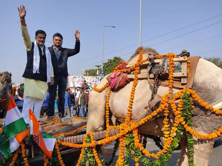 हैं। राजस्थान की राजधानी में बस्तर की भीनी भीनी खुशबू का जादू सिर चढ़कर बोल रहा है।आज सुबह रैली में शामिल होने से पूर्व होटल में कांग्रेस के पूर्व अध्यक्ष राहुल गांधी के साथ नास्ता कर बस्तर सांसद दीपक बैज, राज्य सभा सांसद फूलोदेवी नेताम व छत्तीसगढ़ महिला कांग्रेस प्रभारी सुनीता शेरावत एवं अन्य सांसद बस से सभा स्थल के लिए हुए रवाना। कांग्रेस के नेता अधीर रंजन चौधरी, छत्तीसगढ़ प्रदेश कांग्रेस कमेटी के अध्यक्ष मोहन मरकाम, छत्तीसगढ़ कांग्रेस के सह प्रभारी चंदन यादव तथा अन्य नेता भी साथ में मौजूद रहे। कांग्रेस के युवा नेता हार्दिक पटेल ने बस्तर सांसद दीपक बैज, राज्यसभा सांसद फूलोदेवी नेताम, छत्तीसगढ़ प्रदेश कांग्रेस अध्यक्ष मोहन मरकाम के साथ सेल्फी ली। विदित है कि बस्तर सांसद दीपक बैज और बस्तर की बेटी राज्यसभा सांसद फूलोदेवी नेताम केंद्र सरकार के खिलाफ और छत्तीसगढ़ तथा बस्तर के हक में अपने आक्रामक तेवर के लिए आकर्षण का केंद्र बने हुए हैं। जयपुर प्रवास में बस्तर सांसद दीपक बैज और राज्यसभा सांसद फूलोदेवी नेताम का जलवा रहा। जयपुर में बस्तर का बोलबाला नजर आया। विधि विभाग के जिलाध्यक्ष अवधेश झा एवं महामंत्री ऋषि तिवारी ने ऊंट गाड़ी में सभा स्थल पहुंचकर महंगाई के खिलाफ रोष जताया।कांग्रेस ने महंगाई के विरुद्ध आयोजित जनजागरण महारैली में जोरदार प्रदर्शन किया। पूरे देश के लाखों नेताओं और कार्यकर्ताओं ने भाग लेकर केंद्र की मोदी सरकार के महंगाई के विरुद्ध बिगुल फूंका। विदित है कि की जयपुर में कांग्रेस ने मंहगाई के खिलाफ जन जागरण महारैली का आयोजन किया। जिसे कांग्रेस की राष्ट्रीय अध्यक्ष सोनिया गांधी , पूर्व अध्यक्ष राहुल गांधी एवं राष्ट्रीय महासचिव प्रियंका गांधी, मलिकार्जुन खड़गे, राजस्थान के मुख्यमंत्री अशोक गहलोत, पंजाब के मुख्यमंत्री चरणजीत सिंह चन्नी सहित छत्तीसगढ़ के मुख्यमंत्री भूपेश बघेल सहित कांग्रेस के अन्य राष्ट्रीय नेताओं ने संबोधित किया। इस रैली में शामिल होने के लिए प्रदेश कांग्रेस कमेटी के अध्यक्ष मोहन मरकाम के निर्देश पर विधि विभाग के प्रदेशाध्यक्ष डॉ. देवा देवांगन के नेतृत्व में विधि विभाग के दर्जनों अधिवक्ताओं का दल जयपुर पहुंचा।