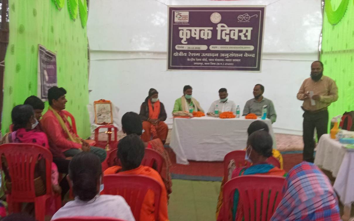 क्षेत्रीय रेशम उत्पादन अनुसंधान केंद्र, धरमपुरा, जगदलपुर द्वारा दिनांक 29.12.2021 को शासकीय रेशम केंद्र , ग्राम मसगांव ,ब्लॉक-बकावंड, जिला – बस्तर मे कृषक दिवस कार्यक्रम का आयोजन किया गया। कार्यक्रम की अध्यक्षता क्षेत्रीय रेशन उत्पादन अनुसंधान केंद्र के सुनील कुमार परीछा, वरिष्ठ तकनीकी सहायक, ने की। मुख्य अतिथि के रूप मे मधुराम कश्यप,सरपंच , जुनावानी,एवं विशेष अतिथि में मंगल साय कश्यप, उपाध्यक्ष वन सुरक्ष्या समिति, जुनावानी, ए.आर. रिज़वी, प्रक्षेत्र अधिकारी ग्रामोद्योग विभाग (रेशम प्रभाग) मसगांव योगदान दिए ।