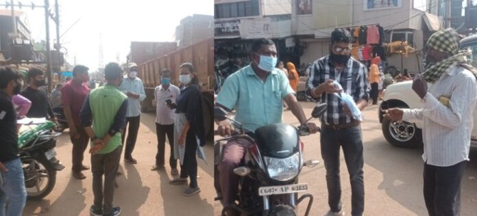 आज रविवार को शहर में कोरोना वायरस के बढ़ते संक्रमण को देखते हुए तहसीलदार, नगर पुलिस एवं नगरपालिका दल्लीराजहरा की संयुक्त टीम ने बिना मास्क घूमने वालों के खिलाफ सख्ती दिखाते हुए चौक चौराहे पर बिना मास्क पहने लोगों के चालान काटे | इसके साथ ही राजहरा व्यापारी संघ के महामंत्री क्रांति जैन द्वारा मास्क न पहनने वालों को मुफ्त में मास्क बांटे | इस कार्यवाही में तहसीलदार नेहा ध्रुव, थाना प्रभारी टी.एस पट्टावी एवम टीम राकेश पाठक, बुद्धिमान सिंग, विपिन बेहरा एवम नगर पालिका की टीम शामिल रहे |