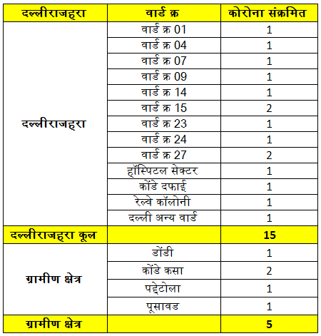 दल्लीराजहरा के वार्ड के अनुसार एवं ग्रामीण क्षेत्रों में मिले कोरोना संक्रमितों की संख्या इस प्रकार है –