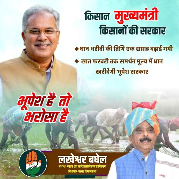 किसानों के हित में निर्णय लेते हुए धान ख़रीदी की समय सीमा को एक सप्ताह बढ़ाने की घोषणा की है | मुख्यमंत्री भूपेश बघेल ने किसानों के हित में निर्णय लेते हुए धान ख़रीदी की समय सीमा को एक सप्ताह बढ़ाने की घोषणा की है |