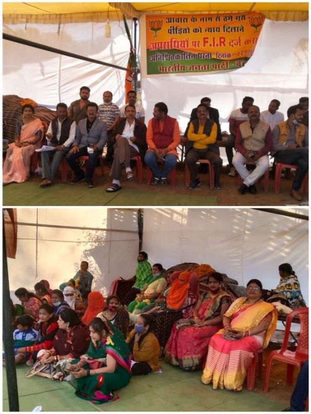 जगदलपुर। संजय गांधी वार्ड पार्षद द्वारा महिलाओं से प्रधानमंत्री आवास दिलवाने के नाम से की गई अवैध उगाही के विरुद्ध बीजेपी का धरना आज आठवें दिन भी जारी है ! इस धरने के का उद्देश्य पीड़ित महिलाओं का एफ आई आर दर्ज कर आरोपी पार्षद एवं अन्य संलीप्तों के विरुद्ध कानूनी कार्रवाई करने की मांग है परंतु आज रिपोर्ट करें चौदहवें दिन भी पुलिस ने पीड़ित महिलाओं के आवेदन पर एफ आई आर दर्ज नहीं किया है।