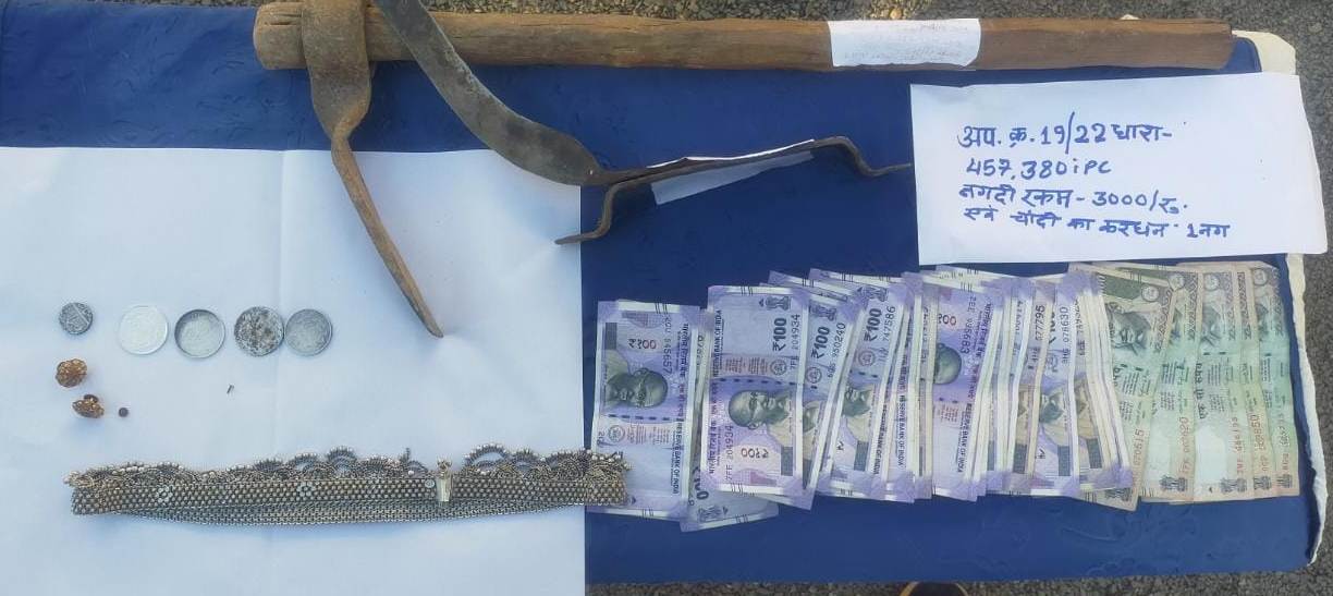 दिनांक 09.02.2022 को ग्राम चीरचार निवासी खोमिन बाई देषमुख पिता स्व.पोषण लाल देषमुख, उम्र 53 वर्ष, साकिन चीरचार, थाना अर्जुन्दा, का थाना आकर रिपोर्ट दर्ज कराया था कि दिनांक 08.02.2022 के सुबह 08/00 बजे अपने घर के अंदर कमरा में ताला लगाकर अपने गांव के तालाब पार में रोजगार गांरटी में काम करने गई थी। काम करके शाम 04/00 बजे घर आयी तो देखी कि बरामदे में लगा ताला टुटा हुआ था अंदर जाकर देखी तो पटाव के उपर का पल्ला निकला हुआ था कमरे में रखें लकड़ी के आलमारी का दरवाजा खुला था व समान बिखरे हुये थें तब आलमारी को देखी तो आलमारी के अंदर का लाक टुटा हुआ था व आलमारी अंदर रखें नगदी रकम 12,500 रू पुरानी इस्तेमाली 38 तोला चांदी का करधन कीमती 17,000 रू, पुरानी इस्तेमाली सोने का खुटी 02 नग, पुरानी इस्तेमाली नाक की फुल्ली 01 नग जुमला 04 ग्राम कीमती 13,000 रू कुल जुमला कीमती 42,500 रू को कोई अज्ञात चोर दिन में चोरी कर ले गया है कि रिपोर्ट पर अपराध कायम कर विवेचना में लिया गया है।