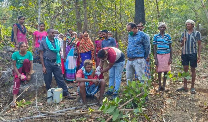 आज बुधवार को जिला प्रशासन द्वारा कोविड टीकाकरण आभियान में अपने शतप्रतिशत लक्ष्य प्राप्ति के लिए चलाये गए आभियान के तहत भानुप्रतापपुर के अंतिम छोर पर बसे ग्राम वनांचल ग्राम कठोली के मराई पारा जो चारो ओर जंगलों और पहाड़ों से घिरा हुवा है वहाँ पर अनुविभागीय अधिकारी(र) जितेंद्र कुमार यादव एवं डिप्टी कलेक्टर विश्वास कुमार के मार्गदर्शन में ग्रामीण चिकित्सा सहायक डॉ नवीन पाण्डेय के नेतृत्व में टीम इस महाआभियान में टीम बनाकर 3 किलोमीटर पहाड़ पर चढ़कर 50 हितग्राहियो को कोविड से बचाव हेतु दूसरा डोज लगाया गया,हितग्राही स्वास्थ्य विभाग की टीम को अपने बीच पाकर बहुत प्रफुलित नजर आए साथ ही टीम का आभार प्रकट भी किया विदित हो कि विभाग द्वारा शतप्रतिशत लक्ष्य प्राप्त करने हेतु रात दिन एक कर जंगल झाड़ी ,खेत खलिहान,पहुँच कर बचे हुवे हितग्राहियो को टीका लगाया गया ,आज इस आभियान में 50 लोगो को टीका लगा इस दौरान डॉ नवीन पाण्डेय,आरएचओ रोहित कवर,शिक्षक लछु राम नुरेटी,वन समिति कठोली के अध्यक्ष रामेश्वर कड़ियाम ,मितानिन रजनी नुरेटी,पुनारी सलाम,शाम बाई कड़ियाम,बुली बाई हुर्रा आदि उपस्थित थे।