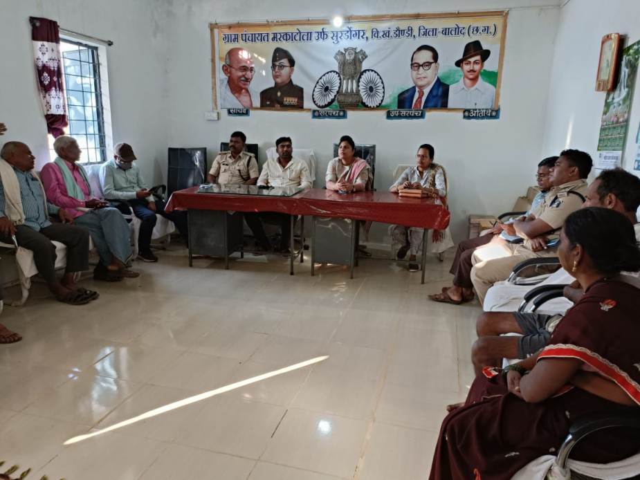 दिनांक 22.02.2022 को एस.डी.एम. प्रेमलता चंदेल, मनोज तिर्की नगर पुलिस अधीक्षक दल्लीराजहरा, नेहाध्रुव तहसीलदार, विनय देवांगन नायब तहसीलदार, थाना प्रभारी डौण्डी अनिल ठाकुर ग्राम सरपंच कोमेश कोर्राम व समस्त ग्रामवासी सुरडोंगर एवं पीड़ित गणेश राम बघेल के परिवार के उपस्थिति में ग्राम सुरडोंगर में मीटिंग लिया गया। जिसमें गणेशराम बघेल के परिवार को उनके परिवार दशरूराम के माध्यम से जमीन दिलाने व मकान दिलाने के संबंध में दोनों पक्ष के बीच आपसी समन्वय बनाते हुए पीड़ित गणेशराम के परिवार को जमीन दिलाने के लिये समस्त ग्रामवासी को सहयोग देने के संबंध में आपसी सहमती बनाया गया। जिसमें ग्राम पंचायत व समस्त ग्रामवासी पीड़ित के साथ मीटिंग रखकर आपस में गांव स्तर पर जमीन दिलाने की बात हुई है, जिससे भविष्य में गांव में किसी प्रकार का शांति भंग न हो जिससे शासन प्रशासन की उपस्थिति में पीड़ित गणेशराम के परिवार को सर्व सुविधा दिलाने का सार्थक प्रयास किया गया एवं पीड़ित गणेशराम को पुनः अतिक्रमण नही करने की समझाईश दी गई |