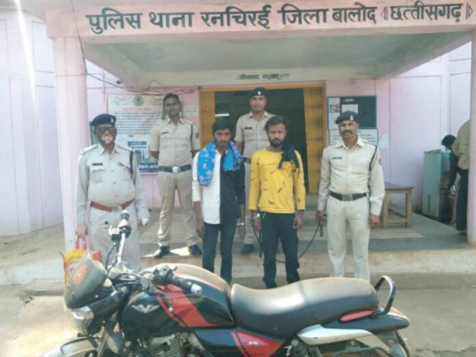 थाना लाकर दोनों संदिग्धों से पूछताछ करने पर अपना नाम (01) राम निर्मलकर पिता रितराम निर्मलकर उम्र 24 वर्ष सा0 रवेली थाना मुजगहन सा0 रवेली थाना मुजगहन जिला रायपुर हाल मुकाम खुरसेंगा, पुलिस चौकी बिरेझर जिला धमतरी (02) जितेन्द्र साहू पिता प्रकाश साहू उम्र 20 वर्ष ग्राम खुरसेंगा, पुलिस चौकी बिरेझर, थाना कुरूद, जिला धमतरी बताये जिनसे कड़ाई से पूछताछ करने पर थाना रनचिरई क्षेत्र में ग्राम फुण्डा में दिनांक 30-31/01/2022 के दरमियानी रात्रि को दोनों मिलकर चोरी करना स्वीकार किये। जिनसे लगातार पूछताछ करने पर बालोद के अतिरिक्त जिला रायपुर के अभनपुर थाना क्षेत्र में मोटर सायकल, धमतरी जिला में बिरेझर चौकी के ढेठा गांव में सोने चांदी के जेवरात एवं नगदी तथा दुर्ग जिले के रानीतराई थाना अंतर्गत ग्राम औसर से सोना चांदी एवं नगदी चोरी करना स्वीकार किये।