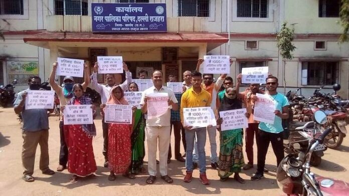 दल्ली राजहरा नगर पालिका द्वारा मकान टैक्स लेट से पटाने के नाम से 1000 रुपये की वसूली, पानी टैक्स को 60 रुपये प्रतिमाह से बढाकर 180 रुपये प्रति माह करने के विरोध व विधानसभा चुनाव 2018 के समय कांग्रेस के द्वारा अपना चुनावी घोषणा पत्र मे किये गये घोषणा अनुसार 60 वर्ष से उपर पेंशन को 350 से बढाकर 1000 रुपये व 75 साल से उपर उम्र वालो को 650 से बढाकर 1500 रुपये करने शहरी क्षेत्र में सम्पत्ति कर को कम कर 50 प्रतिशत करने की घोषणा किया था लेकिन आज तक अमल नही किया गया है घोषणा अनुसार ही जनता को सुविधा दिलाने की मांग को लेकर आज नगर पालिका दल्ली राजहरा पहुचकर नगरवासियो के साथ नगर पालिका उपाध्यक्ष संतोष देवांगन ने मुख्य नगर पालिका अधिकारी से मिलकर घोषणापत्र के अनुसार ही सुविधा देने हेतु मांग किया व आगामी 15 दिनो के अंदर ही इन घोषणाओ को अमल कर नगर के नागरिको को सुविधा उपलब्ध कराई जाये आगामी 15 दिनो के अंदर अमल नही हुआ तो 15 दिन के बाद नगर के जनता व नगर पालिका उपाध्यक्ष संतोष देवांगन खुद नगर पालिका कार्यालय का घेराव किया जायेगा।