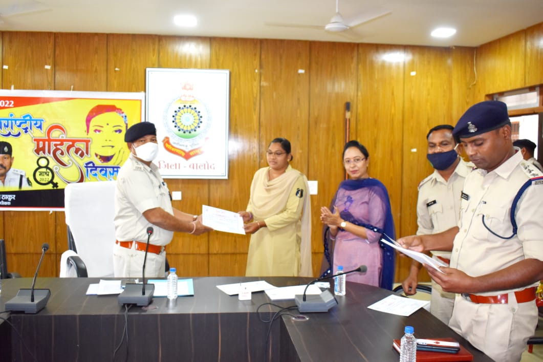 आज दिनांक 08.03.2022 को पुलिस कार्यालय बालोद में अंतर्राष्ट्रीय महिला दिवस के उपलक्ष्य पर पुलिस अधीक्षक महोदय गोवर्धन ठाकुर, डीएसपी नवनीत कौर, डीएसपी राजेश बागड़े, डीएसपी एस.एस मौर्य, रक्षित निरीक्षक मधुसूदन सिंह नाग, महिला सेल प्रभारी पदमा जगत, रीडर 1 नंदकुमार साहू, व जिला बल बालोद की महिला अधिकारी/कर्मचारी सम्मिलित हुए, अंतर्राष्ट्रीय महिला दिवस कार्यक्रम के अवसर पर जिले में सराहनीय कार्य करने वाली सभी महिला अधिकारी/कर्मचारी को पुलिस अधीक्षक व आला अधिकारियों द्वारा प्रशस्ति पत्र देकर सम्मानित किया गया। साथ ही महिलाओं पर होने वाले अपराध जागरूकता, महिलाओं के कानूनी अधिकार, समानता का अधिकार, सामाज परिवार में उनकी भूमिका की सराहना करते हुए महत्त्वपूर्ण जानकारियां साझा कर देश एवं समाज हित कार्यों में सहयोग करने आगे बढ़ने हेतु मोटिवेट कर सभी को अंतर्राष्ट्रीय महिला दिवस की शुभकामनाएं दी गई।