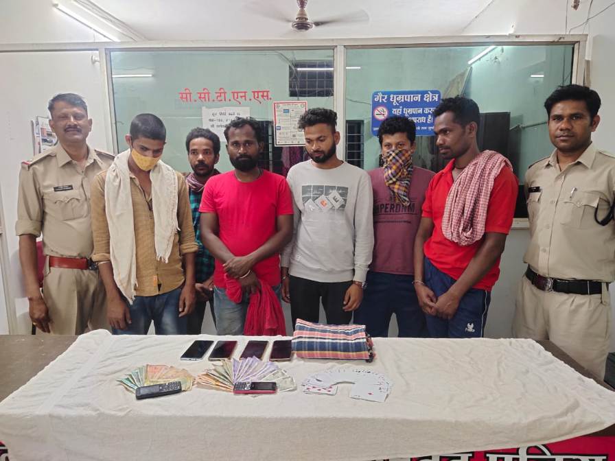 दिनांक 12.03.2022 को थाना कोतवाली क्षेत्रान्तर्गत आसना जंगल में कुछ व्यक्तियों द्वारा तास के 52 पत्तों से रूपये पैसे का दांव लगाकर हारजीत का जुआ खेल रहे है कि सूचना प्राप्त हुई थी जिस पर वरिष्ठ अधिकारियों के निर्देशन में थाना कोतवाली में टीम तैयार कर, तत्काल घटनास्थल पहुंचा जहां पर कुछ व्यक्तियो द्वारा रूपये पैसो का दांव लगाकर जुआ खेलते मिलने पर घेराबंदी कर पकड़ कर पूछताछ किया गया। आरोपी रोहित पानीग्राही, गजेन्द्र बघेल, लिंगेश ठाकुर, राजूनाग, गुप्तेश्वर सागर एवं नविन पवन से मौके पर नगदी रकम 7400/-रूपये, 06 नग मोटर सायकल व 52 पत्ते जप्त किया गया। आरोपियों का कृत्य धारा 13 जुआ एक्ट का घटित करना पाये जाने से थाना कोतवाली जगदलपुर में अप0क्र0-89/2022 धारा 13 जुआ एक्ट के तहत् अपराध पंजीबद्ध कर आरोपियों को गिरफ्तार कर, जमानत मुचलका पर रिहा किया गया।