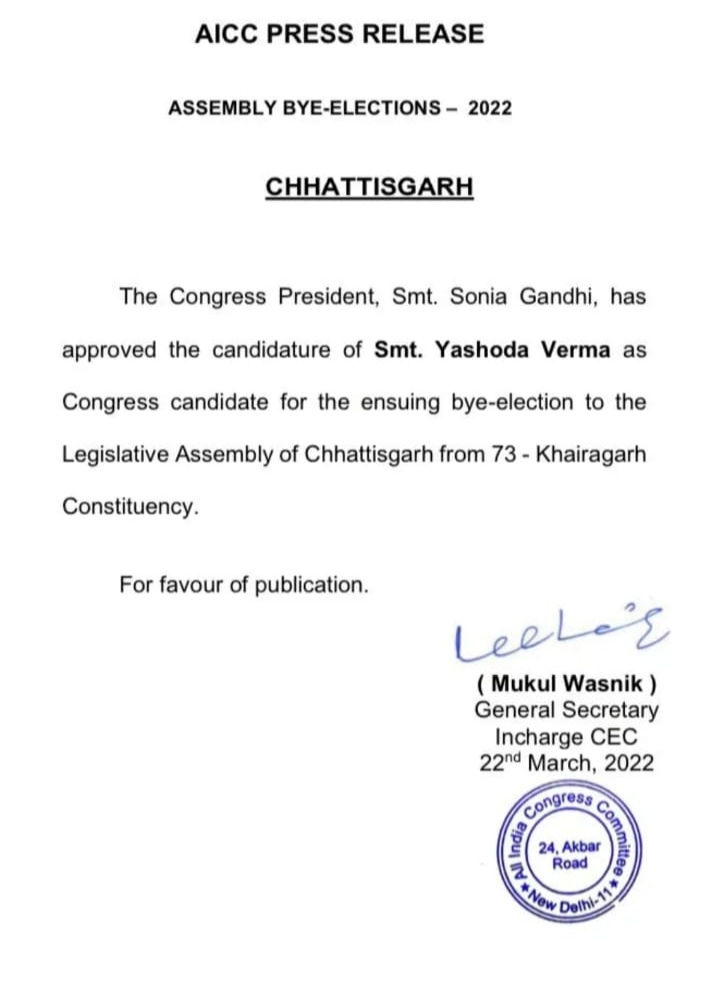 कांग्रेस ने खैरागढ़ उप चुनाव के लिए उम्मीदवार की घोषणा कर दी है। उप चुनाव के लिए यशोदा वर्मा कांग्रेस की उम्मीदवार होंगी। वर्मा अभी जिला पंचायत की सदस्य और ब्लॉक कांग्रेस कमेटी की अध्यक्ष हैं। यशोदा का चुनाव 24 दावेदारों में से किया गया है। अब पार्टी उनके नामांकन की तैयारी कर रही है।