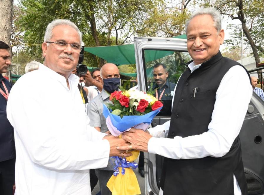 रायपुर। मुख्यमंत्री भूपेश बघेल ने आज यहां अपने निवास कार्यालय में राजस्थान के मुख्यमंत्री अशोक गहलोत का आत्मीय स्वागत किया। मुख्यमंत्री गहलोत आज दोपहर रायपुर पहुंचे। वे एयरपोर्ट से सीधे मुख्यमंत्री निवास पहुंचे।
