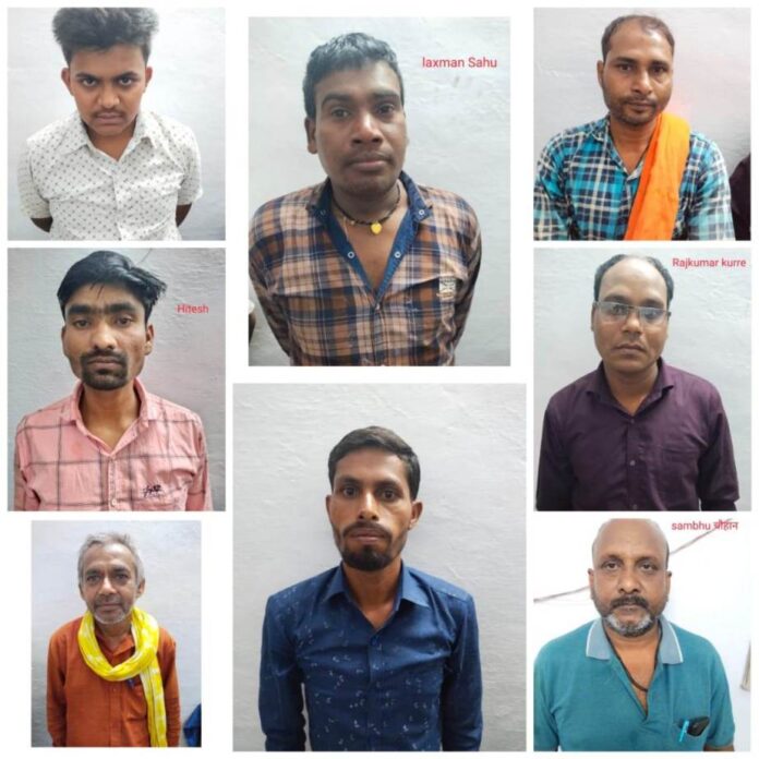 जिनके विरूद्ध धारा 13 जुआ एक्ट का अपराध घटित करना पाये जाने से अपराध धारा सदर पंजीबद्ध कर विवेचना में लिया गया आरोपी – 01. राजकुमार साहु पिता गिरधारी लाल साहु उम्र 29 साल साकिन भुसरेंगा थाना रनचिरई जिला बालोद 02. शंभु चौहान पिता आरबी चौहान उम्र 48 साल साकिन सेक्टर 07 भिलाई जिला दुर्ग 03. ब्रीजभान जोशी पिता गरीबा जोशी उम्र 33 साल साकिन कोडेवा थाना अर्जुन्दा जिला बालोद 04. लक्ष्मण साहु पिता इशराम साहु उम्र 36 साल साकिन पेण्ड्री थाना लालबाग जिला राजनांदगांव 05. जनक देशमुख पिता लखन लाल उम्र 60 साल साकिन कोडेवा थाना अर्जुन्दा जिला बालोद 06. राजकुमार पिता छन्नु लाल उम्र 40 साल साकिन निपानी थाना बालोद जिला बालोद 07. हितेश कुमार कौशिक पिता डोमार सिंह उम्र 33 साल साकिन निपानी थाना बालोद जिला बालोद 08. सोनू ऊर्फ अन्नु सिन्हा पिता घनश्याम सिन्हा उम्र 24 साल साकिन कन्हारपुरी जिला राजनांदगांव से कुल जुमला रकम 7300/- रूपये एवं 52 पत्ती ताश मिला जिसे मुताबिक जप्ती पत्रक के जप्त् कर पुलिस कब्जा में लिया गया। इस प्रकार कुल 08 आरोपियों के विरूद्ध बडी कार्यवाही की गई । उक्त प्रकरण की कार्यवाही में प्र0आर0 विकास सिंह, आर0 धमेन्द्र चन्द्रवंशी, आर0 भूपत मानिकपुरी , आर0 कमलेश रावटे, आर0 भालेश्वर देवांगन, आर0 पिताम्बर ठाकुर की विशेष भूमिका रही।